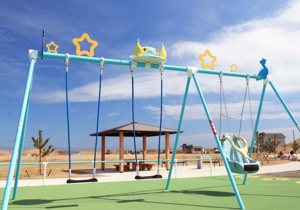 ラプラス公園には、ラプラスの背中を滑って遊ぶ大型遊具の「みんなのラプラス」や、ラプラスに乗って遊ぶ「ゆらゆらラプラス」、道具を使って音を鳴らす「ウミディグダのチャイム」など楽しい遊具がたくさんあります!